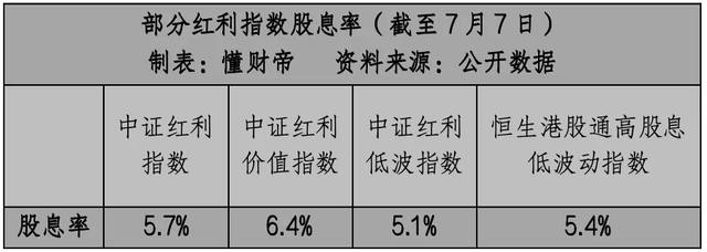 截至7月7日,中证红利指数的股息率为5.7%,中证红利价值指数的股息率为6.4%,中证红利低波指数的股息率为5.1%,恒生港股通高股息低波动指数的股息率为5.4%。